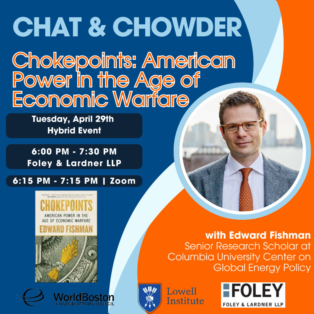 Join us for this installment of our popular Chat & Chowder series, featuring Senior Research Scholar and Adjunct Professor of International and Public Affairs, Edward Fishman. Mr. Fishman will discuss his new book “Chokepoints: American Power in the Age of Economic Warfare.”