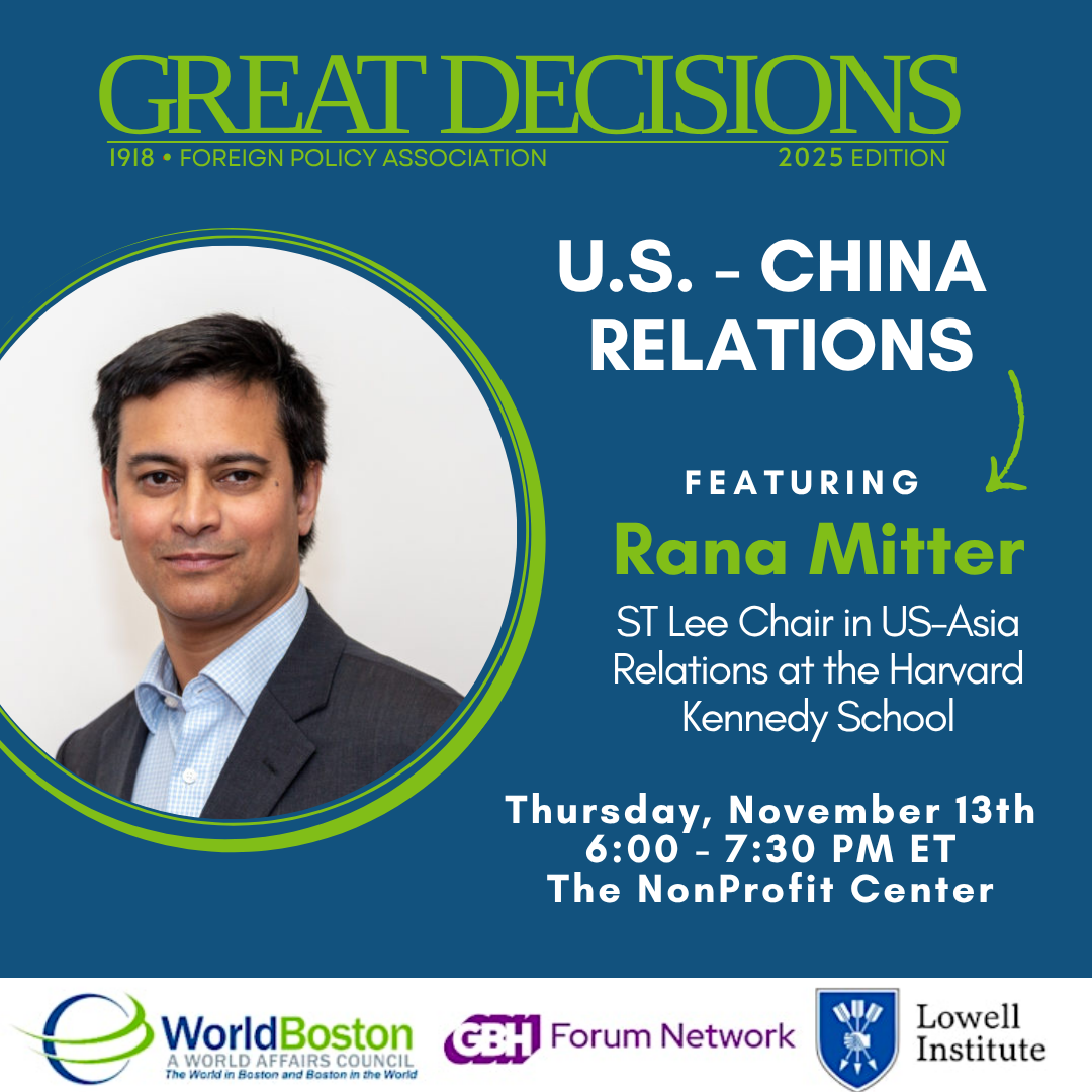 Join us for a timely discussion of this topic with Rana Mitter, ST Lee Chair in U.S.-Asia Relations at the Harvard Kennedy School. This program will feature an expert presentation, live audience Q&A, and time for networking and discussion with other globally-oriented participants.