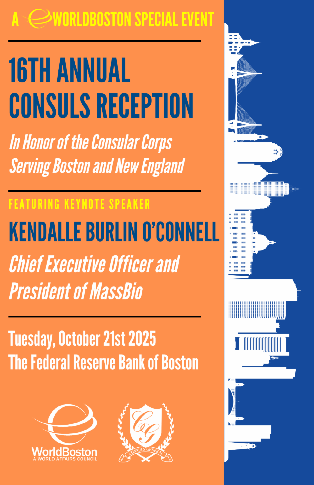 This year, the 16th Annual Consuls Reception will take place on October 21st, 2025. We’re honored to host Kendalle Burlin O'Connell, CEO and President of MassBio, who will offer remarks. And, we are thrilled to return the Consuls Reception to the beautiful Harborview Room on the 31st floor of the Federal Reserve Bank of Boston.
