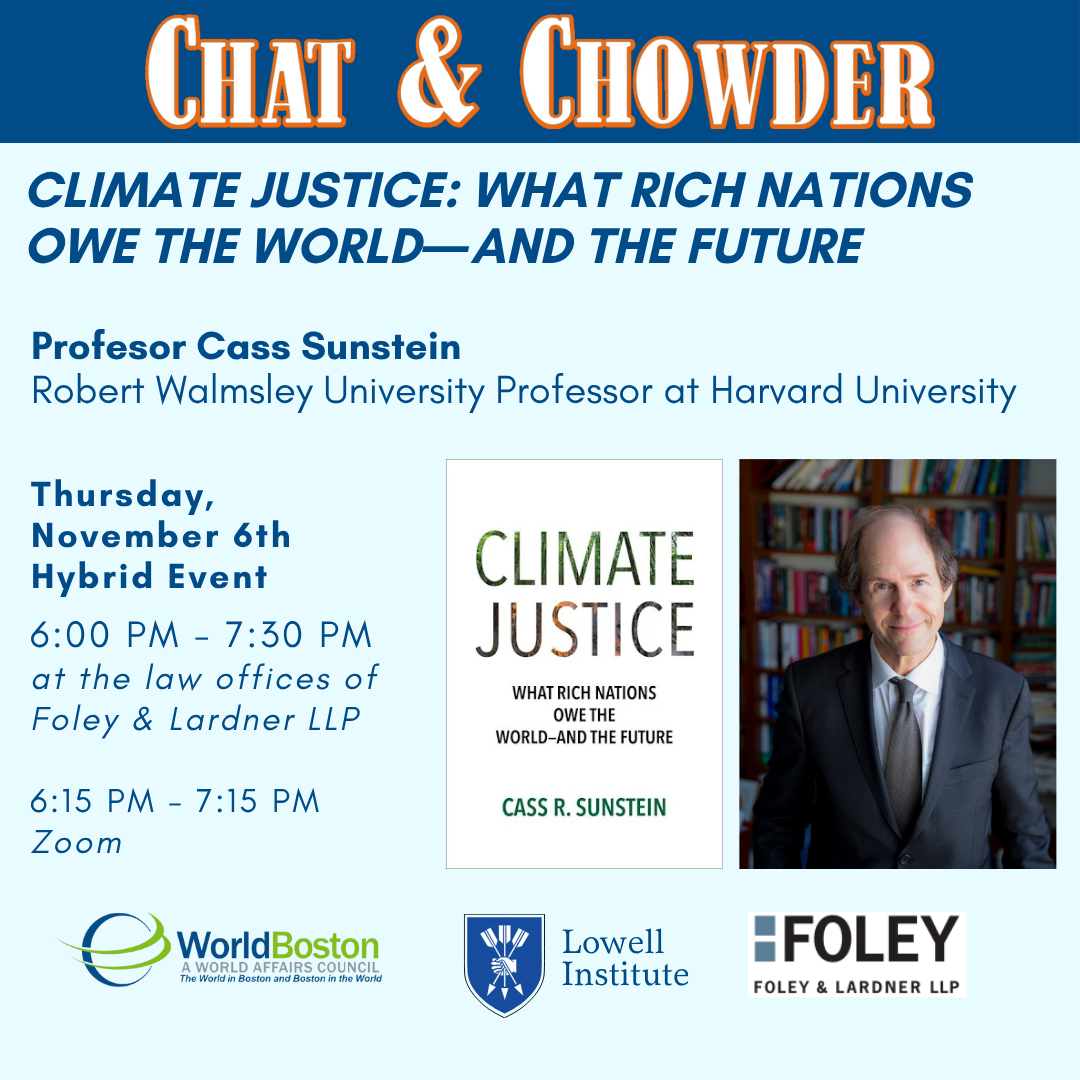 Join us for this installment of our popular Chat & Chowder series, featuring the Robert Walmsley University Professor at Harvard University, Dr. Cass R. Sunstein. Dr. Sunstein will discuss his new book, Climate Justice: What Rich Nations Owe the World — and the Future.