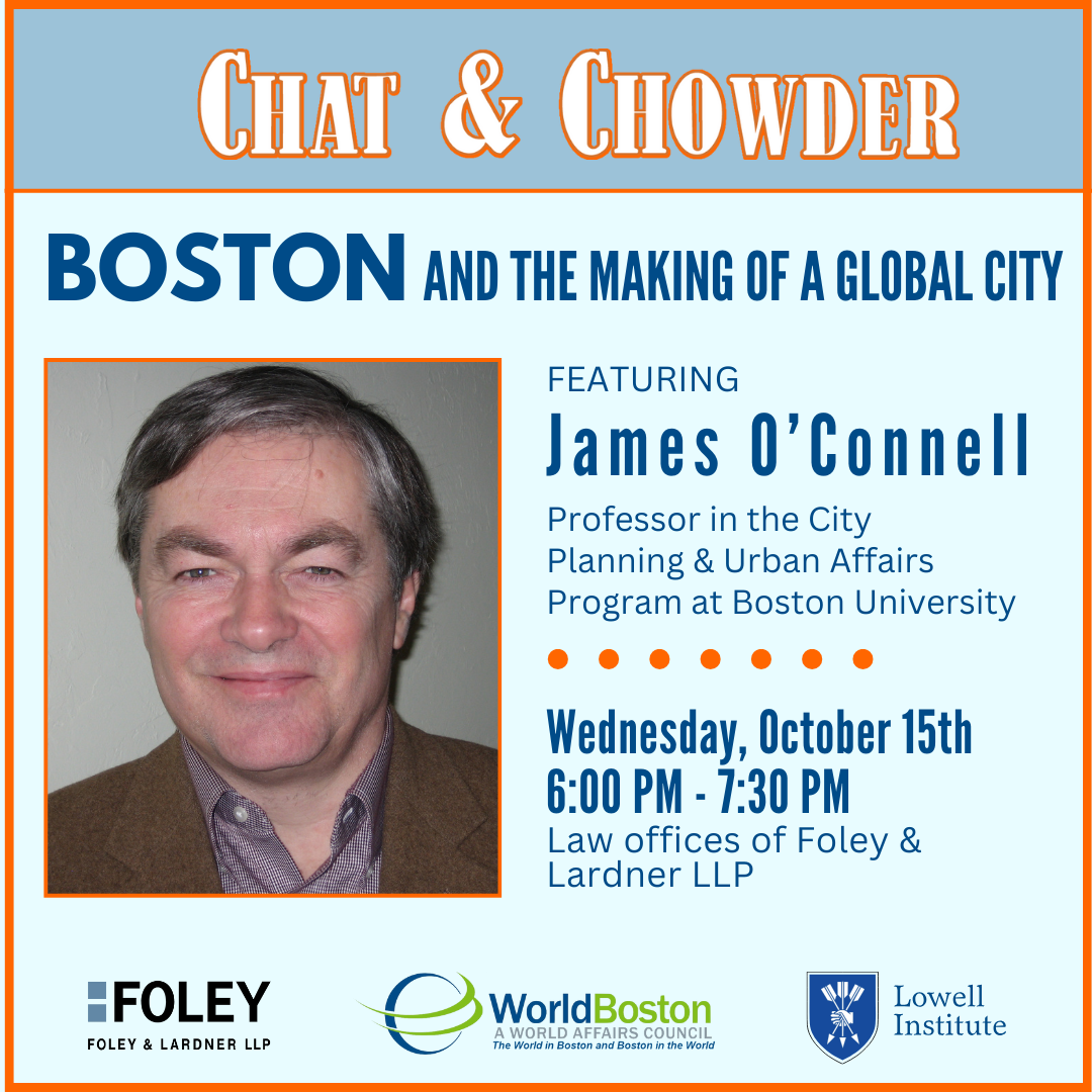 Join us for this installment of our popular Chat & Chowder series, featuring James O'Connell, Professor of City Planning & Urban Affairs at Boston University. Dr. O'Connell will discuss his new book, Boston and the Making of a Global City.